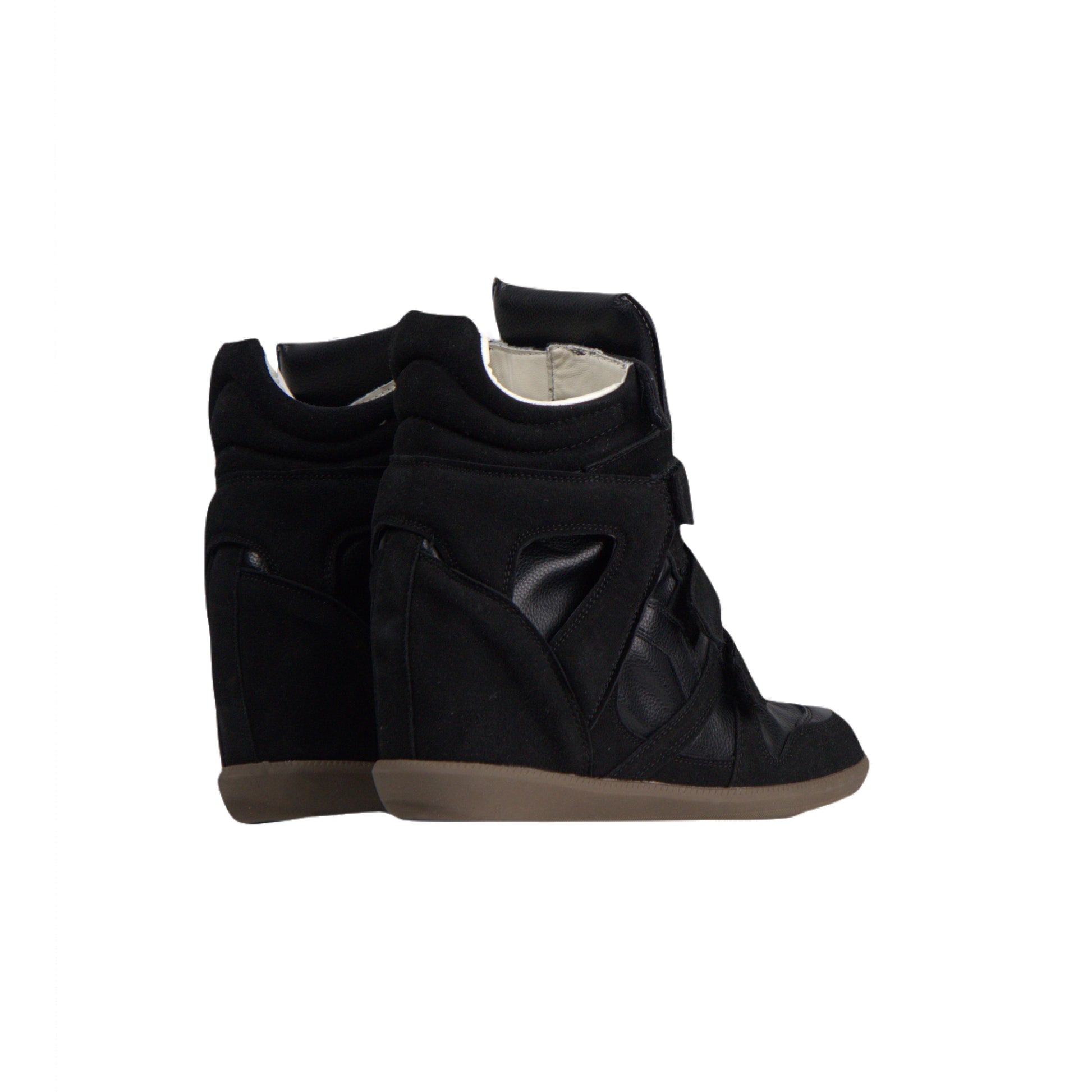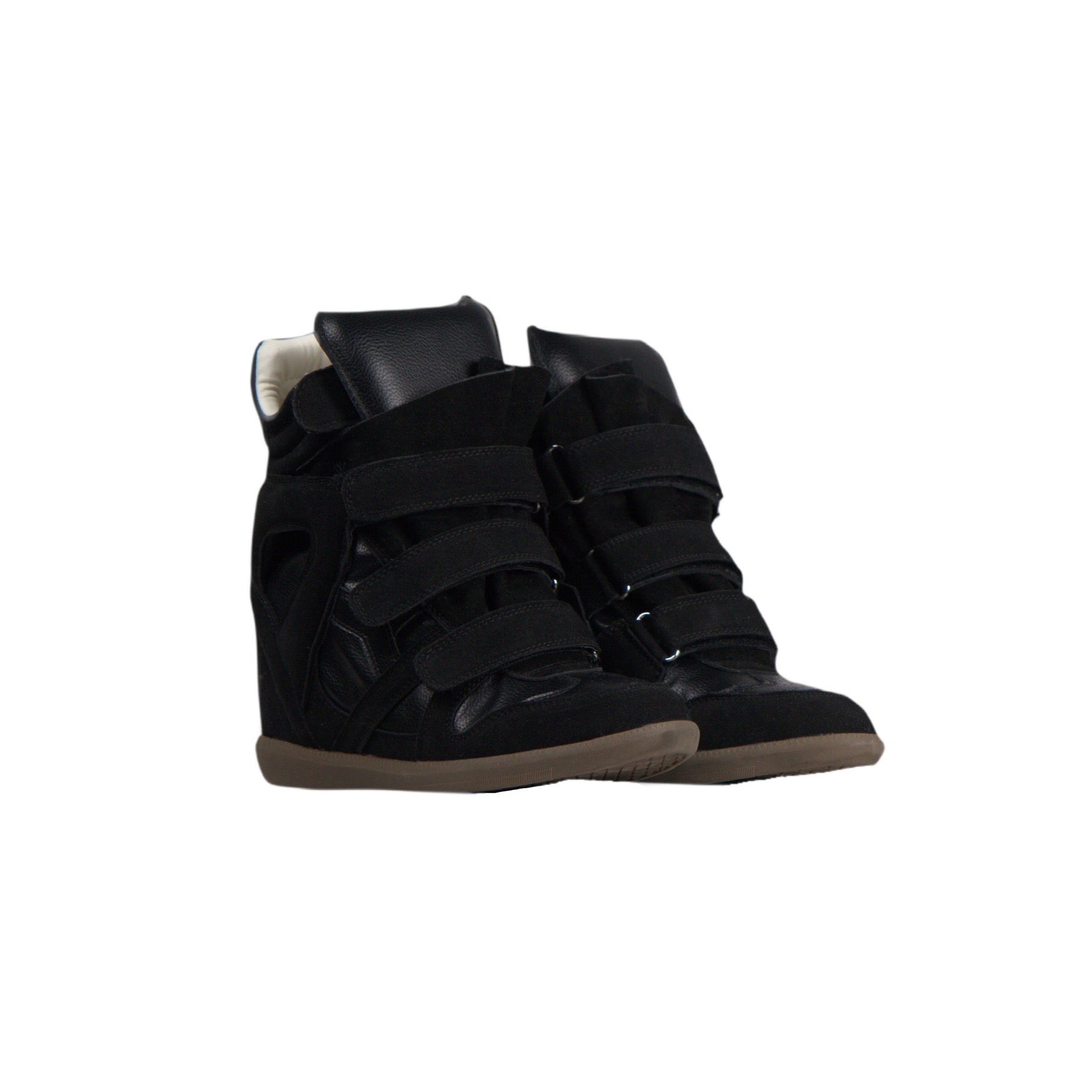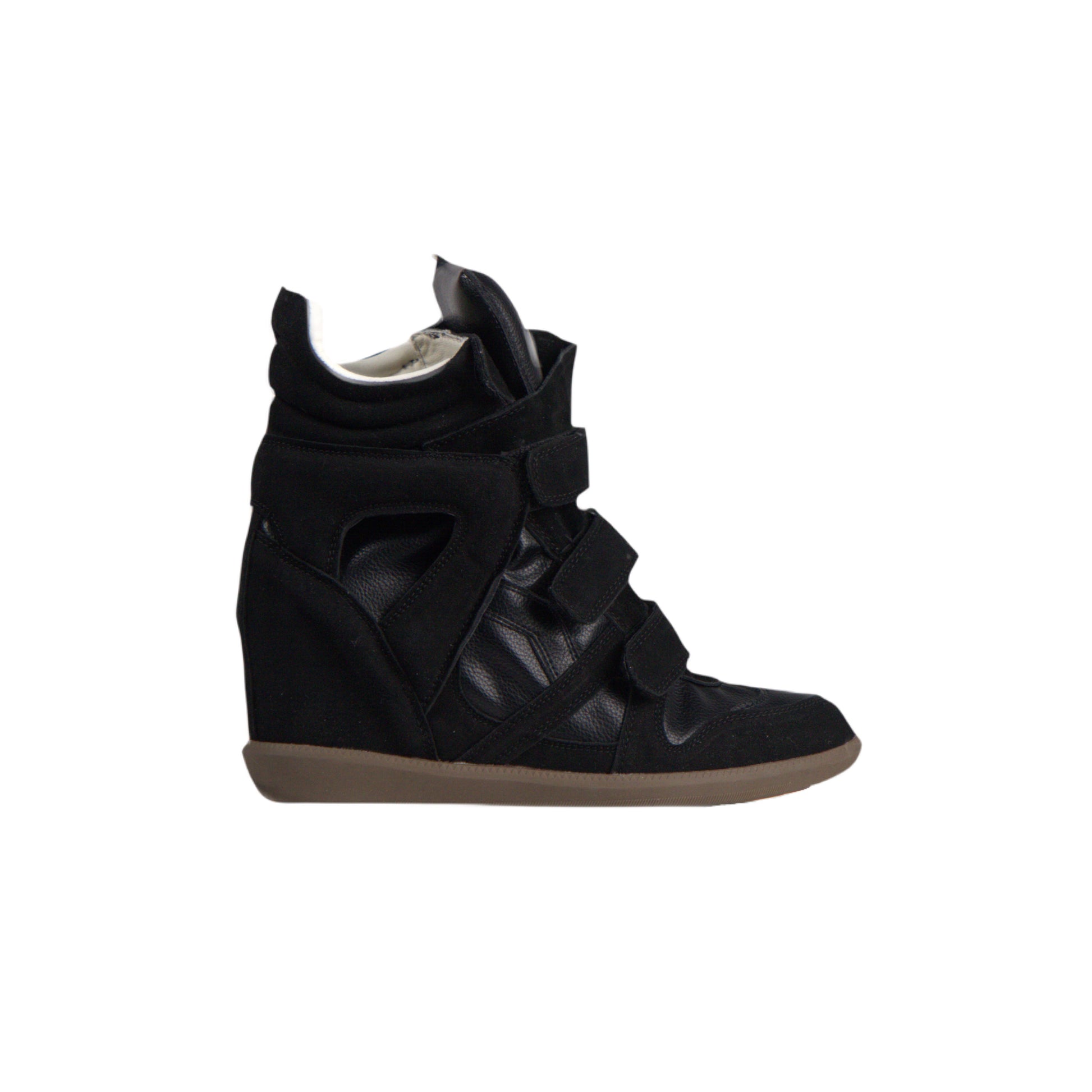 This sleek high-top sneaker features an all-black design with a mix of smooth leather and suede panels, paired with a subtle gum sole. Its hidden wedge heel and secure Velcro straps offer a modern, elevated silhouette without compromising comfort. Versatile and stylish, it’s the perfect statement piece for casual looks or chic streetwear outfits.