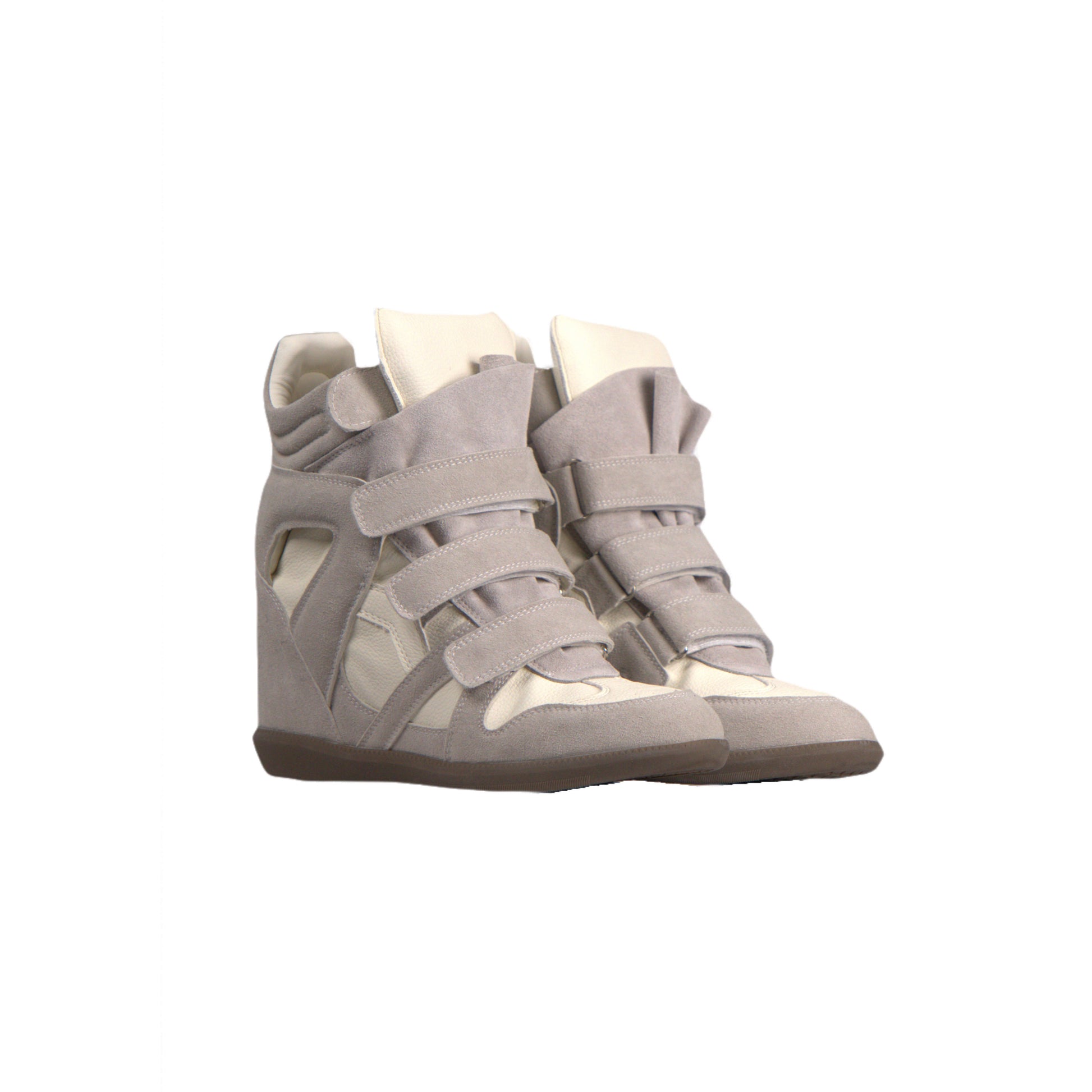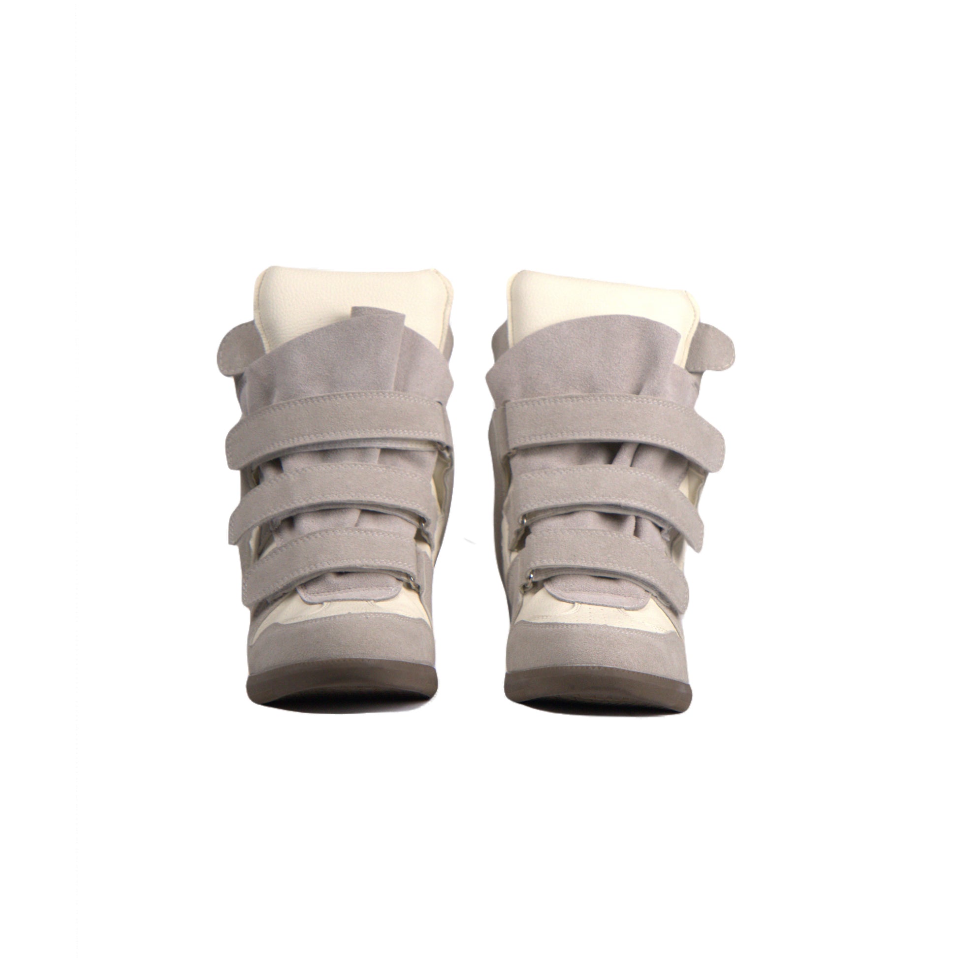 This sleek high-top sneaker features an all-black design with a mix of smooth leather and suede panels, paired with a subtle gum sole. Its hidden wedge heel and secure Velcro straps offer a modern, elevated silhouette without compromising comfort. Versatile and stylish, it’s the perfect statement piece for casual looks or chic streetwear outfits.